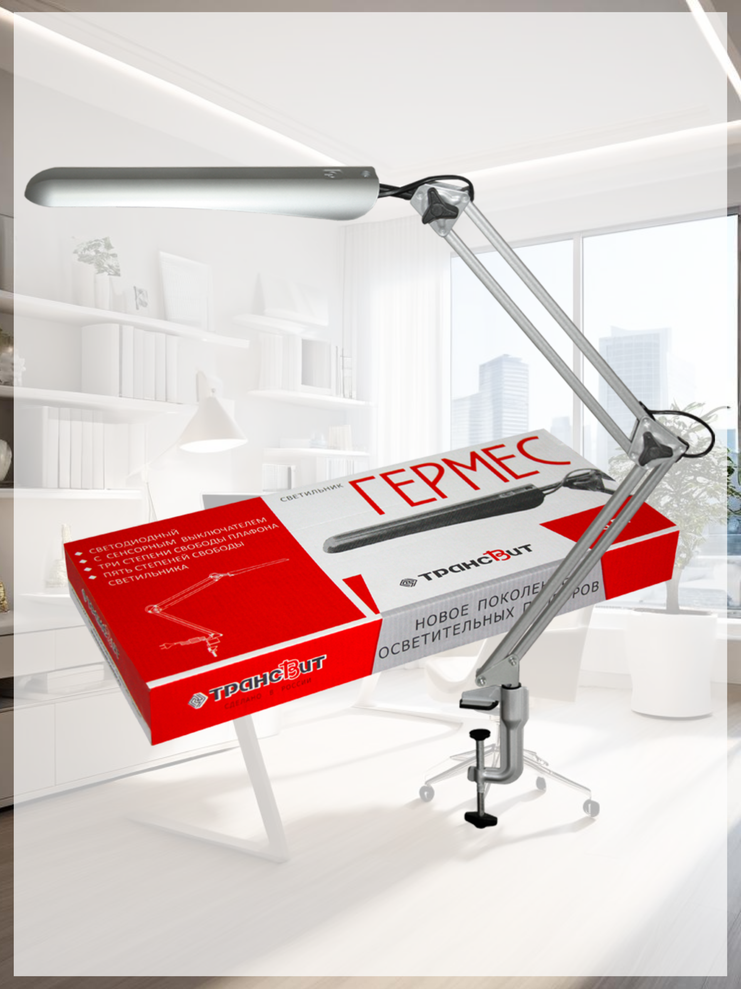 Светильник Трансвит Гермес офисный для рабочего стола на пантографе, сенсорная регулировка яркости, на струбцине, LED 8 Вт, серебро