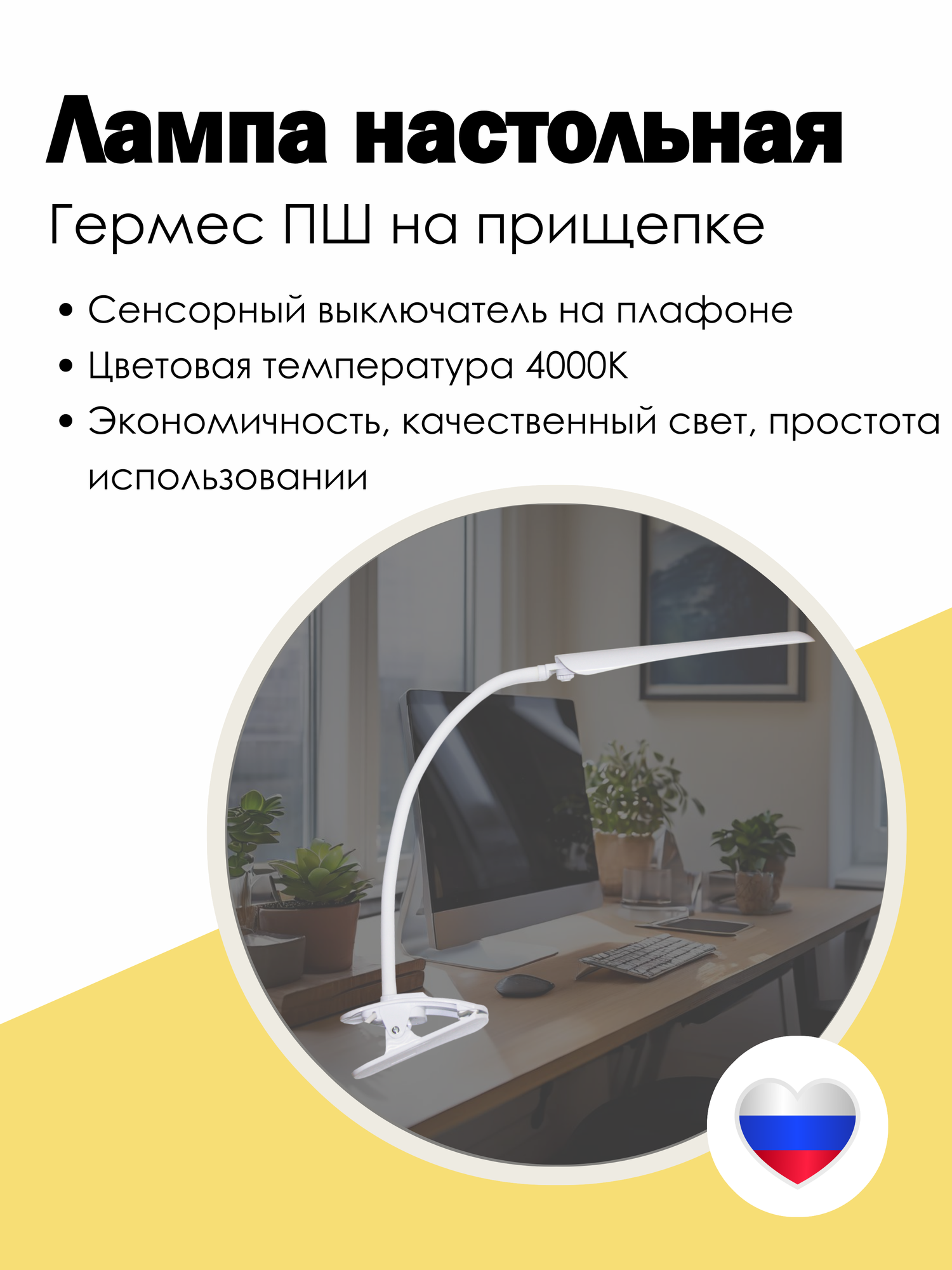 СохранитьЛампа настольная на гибкой ножке светодиодная Гермес ПШ, офисная на прищепке в розетку с выключателем LED 8 Вт, белый, Трансвит интересное: