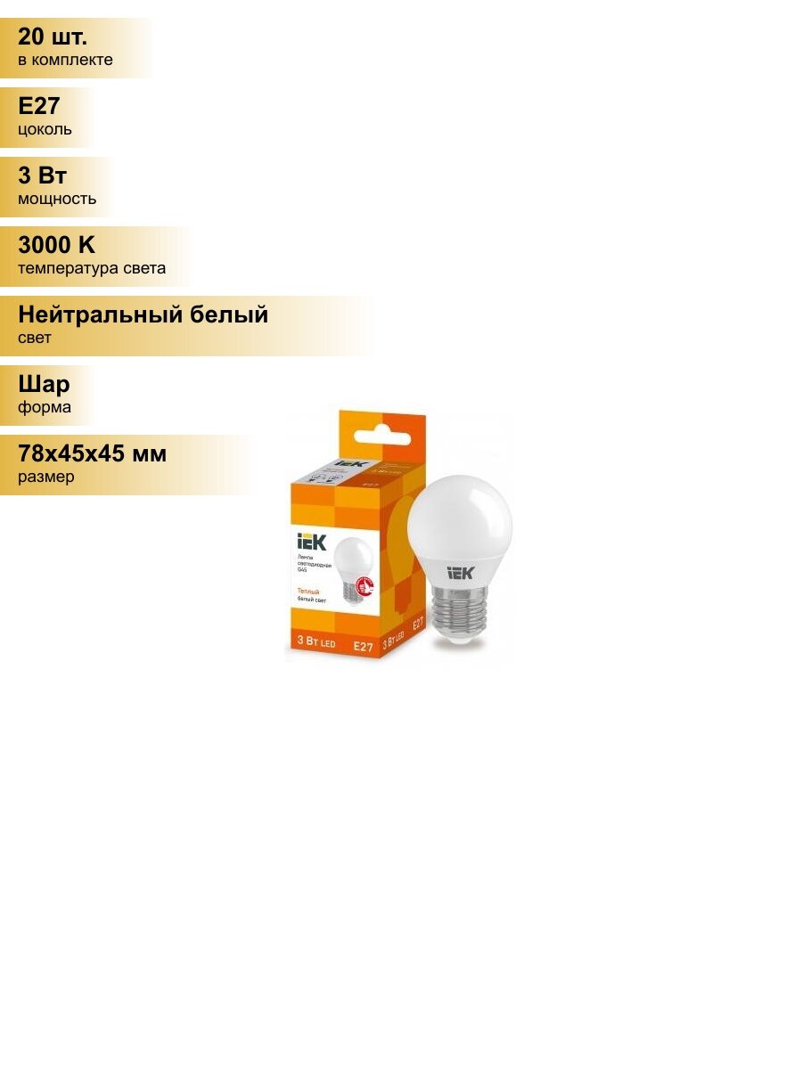 Сохранить(20 шт.) Светодиодная лампочка IEK шар G45 E27 3W(210lm) 3000K 2K 78x45 матов. ECO LLE-G45-3-230-30-E27 Нейтральный белый. Цоколь E27 интересное: