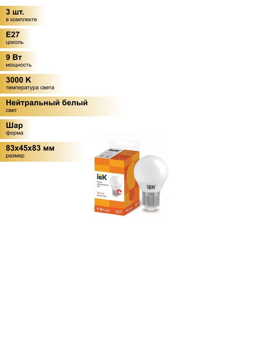 Купить (3 шт.) Светодиодная лампочка IEK шар G45 E27 9W(810lm) 3000К 3K ECO LLE-G45-9-230-30-E27 Нейтральный белый. Цоколь E27