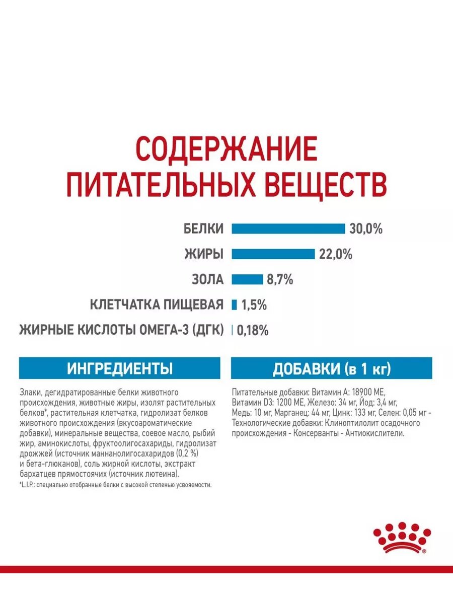 | Состав | дегидратированные белки животного происхождения (птица), рис, животные жиры, изолят растительных белков*, пшеница, растительная клетчатка, гидролизат белков животного происхождения (вкусоароматические добавки), минеральные вещества, соевое масло, рыбий жир, фруктоолигосахариды, гидролизат дрожжей (источник мaннановых олигосахаридов), соль жирной кислоты, экстракты дрожжей (источник бета-глюканов), экстракт бархатцев прямостоячих (источник лютеина); питательные добавки: витамин A: 19000 ME, витамин D3: 1200 ME, железо: 38 мг, йод: 3,8 мг, медь: 12 мг, марганец: 49 мг, цинк: 147 мг, сeлeн: 0,06 мг - технологические добавки: клиноптилолит осадочного происхождения: 10 г - консерванты - антиокислители |