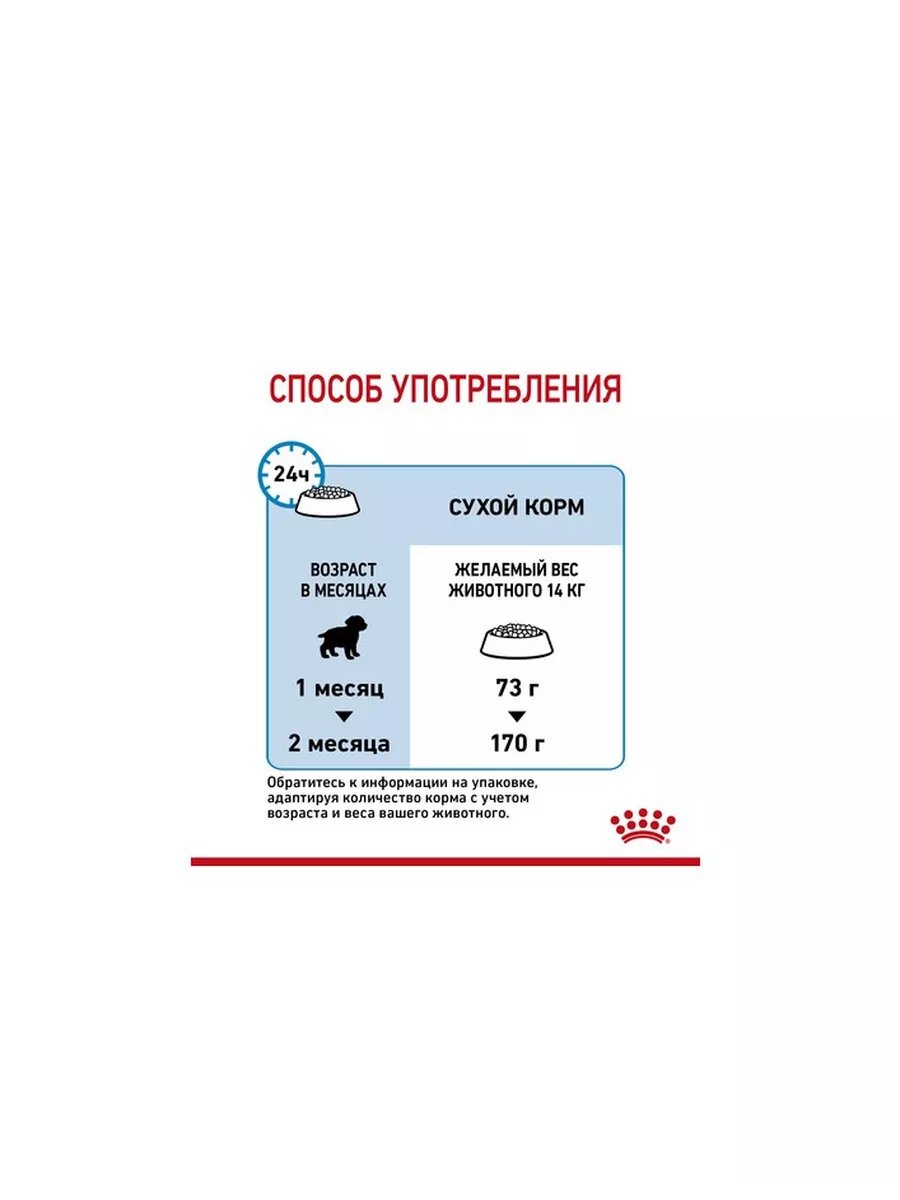 | Дополнительная информация | Start Complex/Естественные механизмы защиты; 1) здоровье пищеварительной системы: Программа Start Complex, разработанная в научных лабораториях Royal Canin, представляет собой комбинацию питательных веществ, имеющихся в сучьем молоке, усиленную дополнительными компонентами, которые обеспечивают здоровое пищеварение и укрепляют естественный иммунитет щенка; 2) поддержка в период беременности и лактации: Питательный состав адаптирован к высоким энергетическим потребностям собаки в конце беременности и в период лактации; 3) легко размачиваются: Крокеты обладают высокой вкусовой привлекательностью для собак и щенков в период отъема, а также легко размачиваются до консистенции каши, которая облегчает переход от материнского молока к твердой пище |