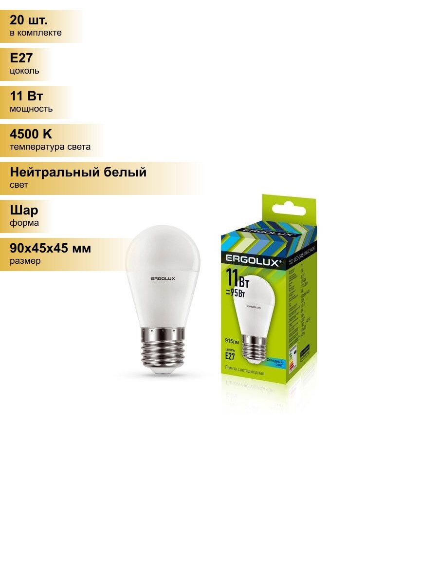 Купить (20 шт.) Светодиодная лампочка Ergolux шар G45 E27 11W(915lm 220°) 4500K 4K матовая 90x45 LED-G45-11W-E27-4K Нейтральный белый. Цоколь E27