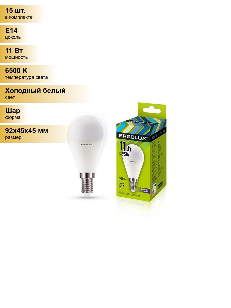 Сохранить(15 шт.) Светодиодная лампочка Ergolux шар G45 E14 11W(925lm 220°) 6500K 6K матовая 92x45 LED-G45-11W-E14-6K Холодный белый. Цоколь E14 интересное: