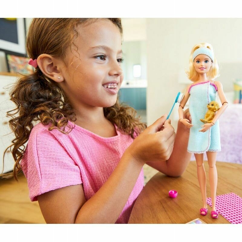 Кукла Barbie GJG55 Wellness Spa, блондинка, со щенком и 9 аксессуарами, включая подушку для шеи, резиновую уточку и маску для глаз в виде огурца, игрушка в подарок для детей от 3 до 7 лет