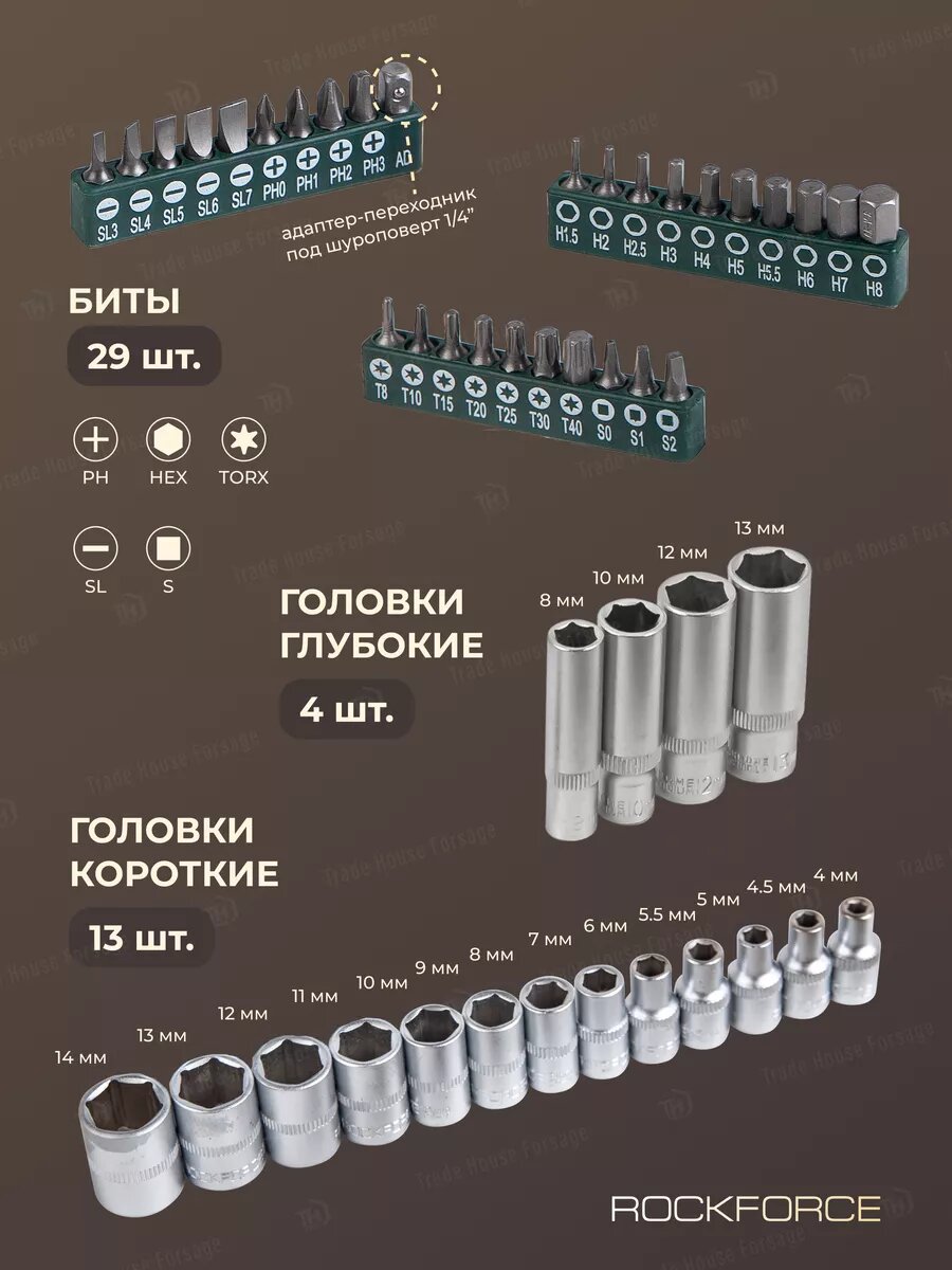 | Головки торцевые подробно | 1/2": 14, 15, 16, 17, 18, 19, 20, 22, 24, 27, 30, 32 мм; свечные 1/2": 16, 21 мм; 1/4": 4, 4.5, 5, 5.5, 6, 7, 8, 9, 10, 11, 12, 13, 14 мм; с битами 1/4": H3, H4, H5, H6, T8, T10, T15, T20, T25, T30, SL4, SL5.5, SL7, PH1, PH2, PZ1, PZ2; адаптер 3/8"(F)x1/2"(M); трещотка 1/2"; карданный шарнир 1/2"; удлинитель 1/2": 125, 250 мм; удлинитель 1/4": 50, 100 мм; гибкий удлинитель 1/4"; карданный шарнир 1/4"; трещотка 1/4"; держатель биты 1/2"x5/16" |