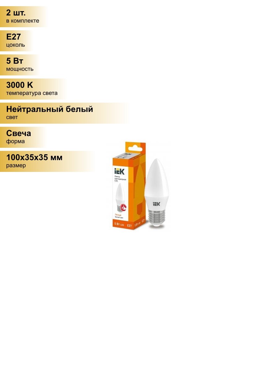 Купить (2 шт.) Светодиодная лампочка IEK свеча C35 E27 5W(450lm) 3000K 2K 100x35 матов. ECO LLE-C35-5-230-30-E27 Нейтральный белый. Цоколь E27