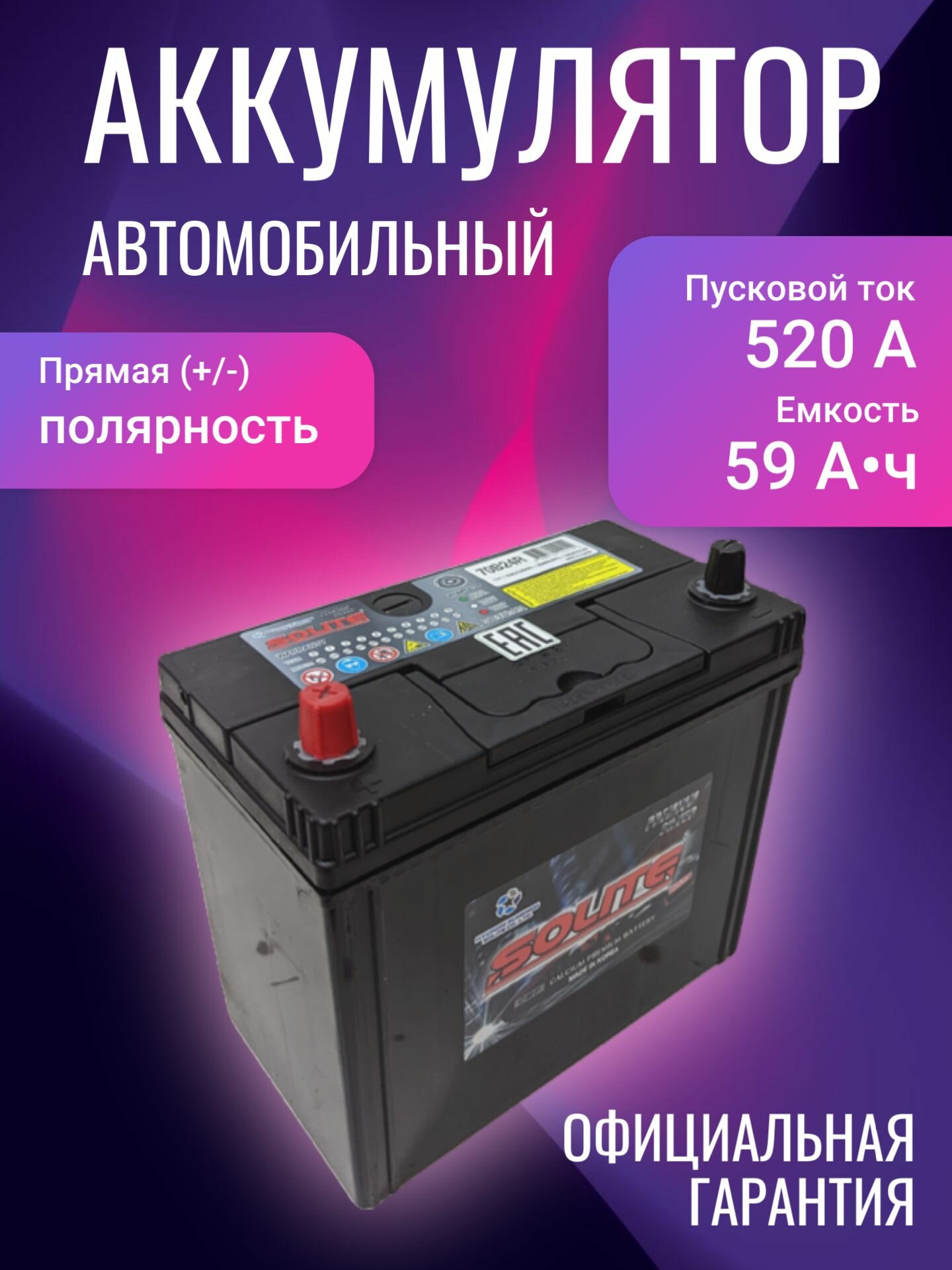 Аккумулятор автомобильный Solite Silver 70B24R 59Ач L+ CCA520A 236x128x220 B00 (тонкая клемма)