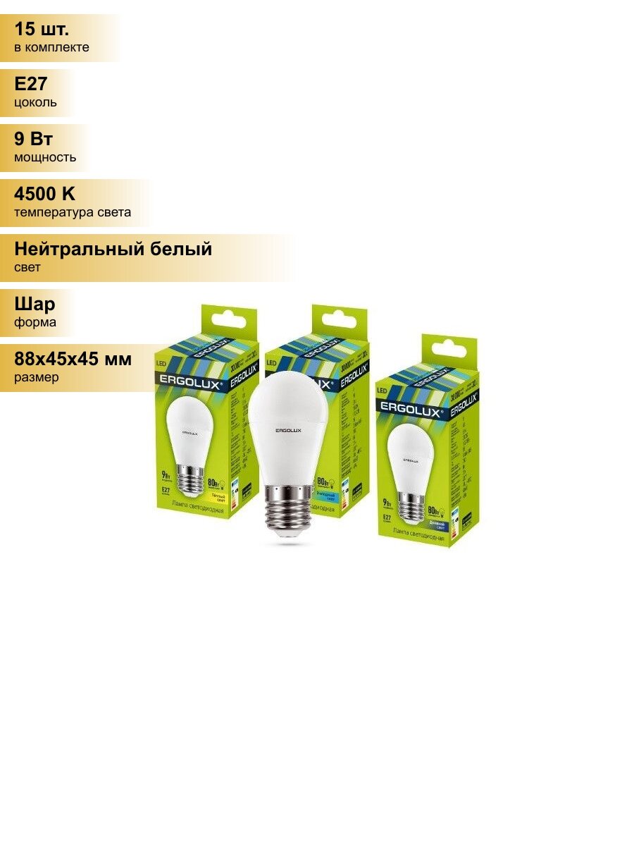 Купить (15 шт.) Светодиодная лампочка Ergolux шар G45 E27 9W(780lm 220°) 4500K 4K матовая 88x45 пластик/алюм. LED-G45-9W-E27-4K Нейтральный белый. Цоколь E27