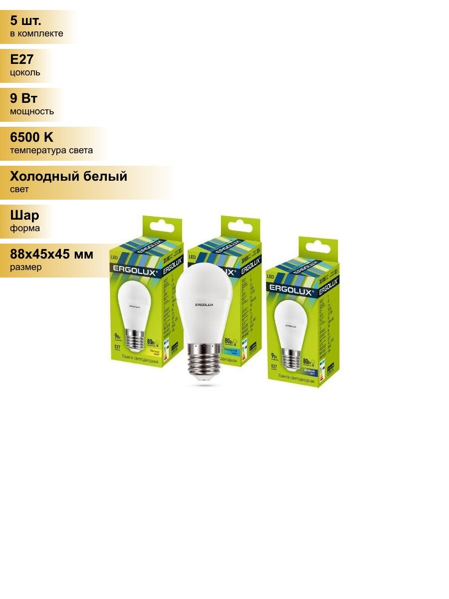 Купить (5 шт.) Светодиодная лампочка Ergolux шар G45 E27 9W(800lm 220°) 6500K 6K матовая 88x45 пластик/алюм. LED-G45-9W-E27-6K Холодный белый. Цоколь E27
