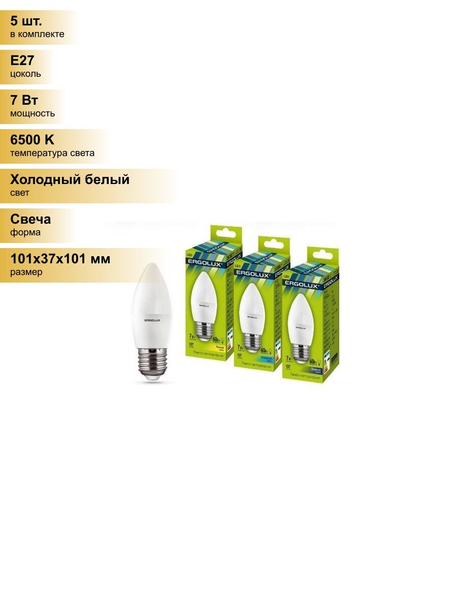 Сохранить(5 шт.) Светодиодная лампочка Ergolux свеча C35 E27 7W(560lm 220°) 6500K 6K матовая 101x37 пластик/алюм. LED-C35-7W-E27-6K Холодный белый. Цоколь E27 интересное: