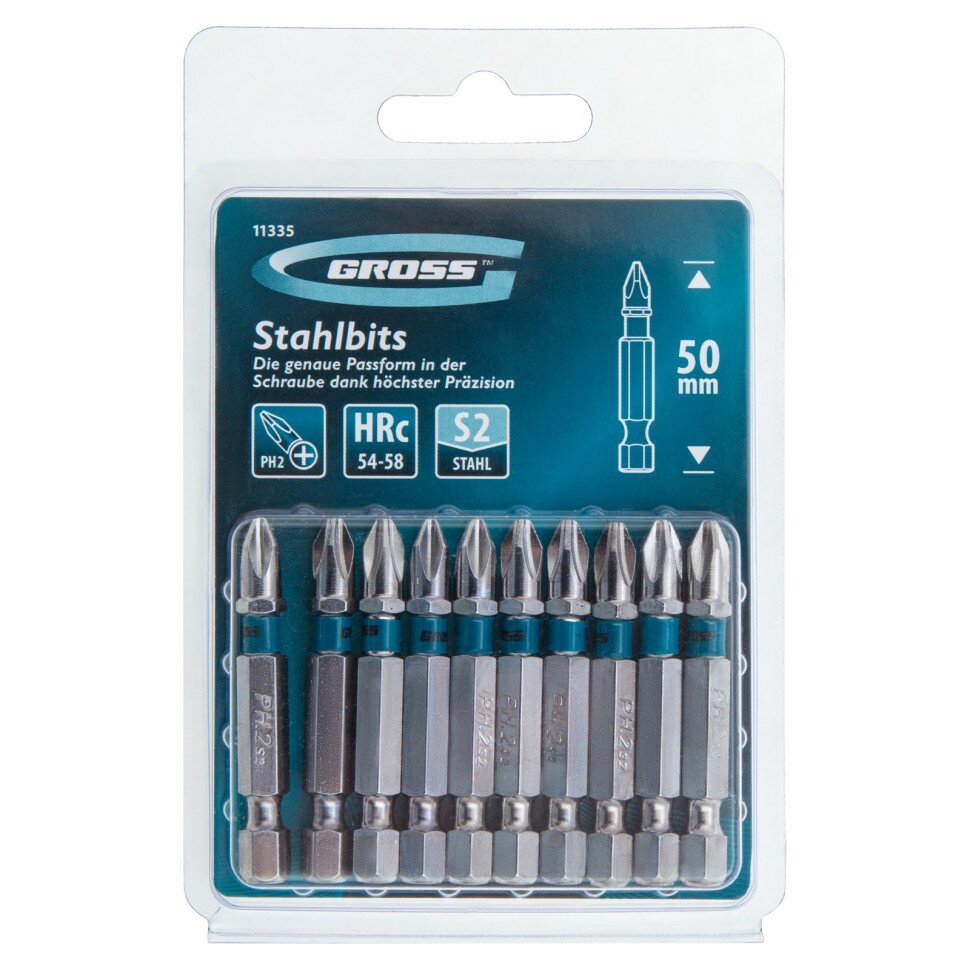 Набор бит Gross PH2х50 из легированной стали S2 твердостью 54-58 HRC, 10 шт 11335