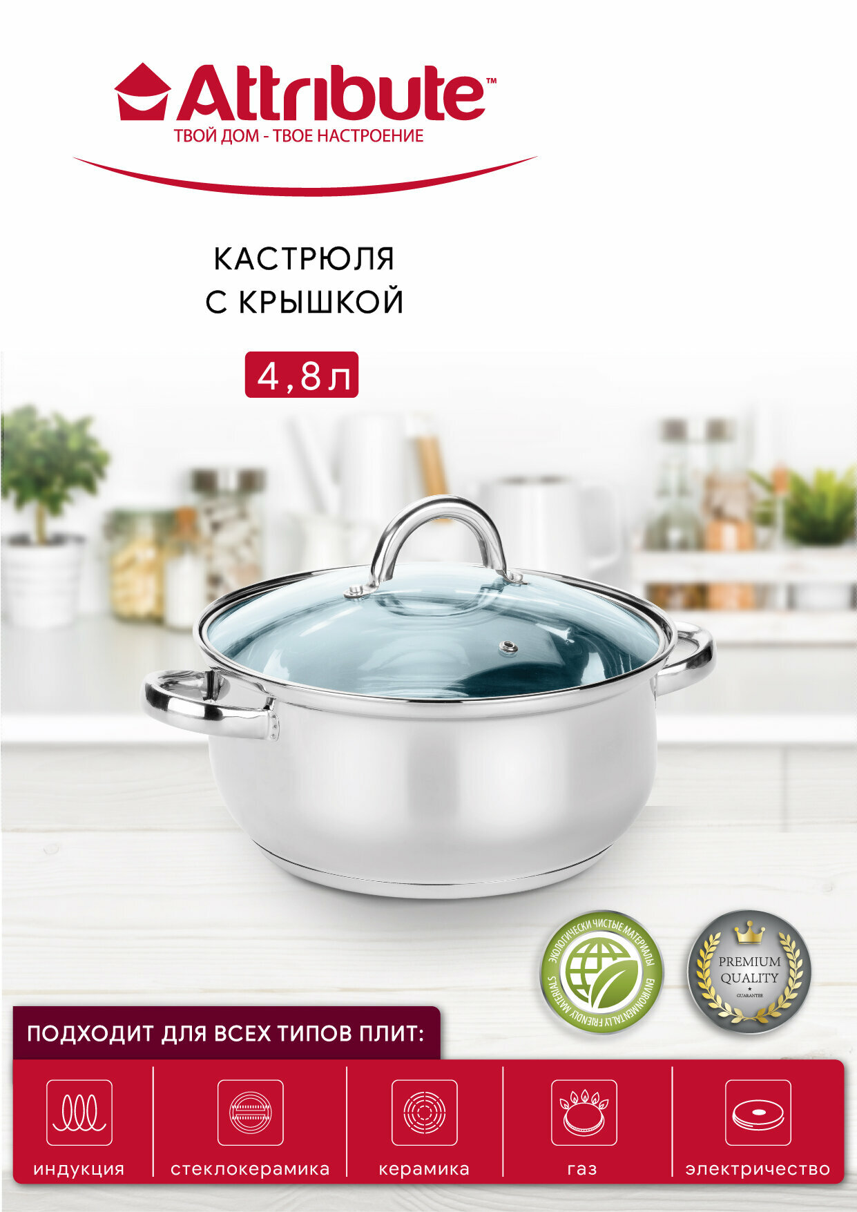 Кастрюля из нержавеющей стали со стеклянной крышкой 4,8 л, GRACE 24х11.5см,ATTRIBUTE STEEL