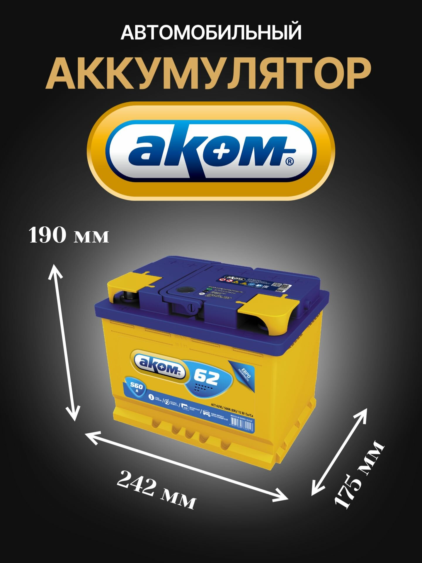 Купить Аккумулятор автомобильный АКОМ 62 R+ 12В 62Ач 560А