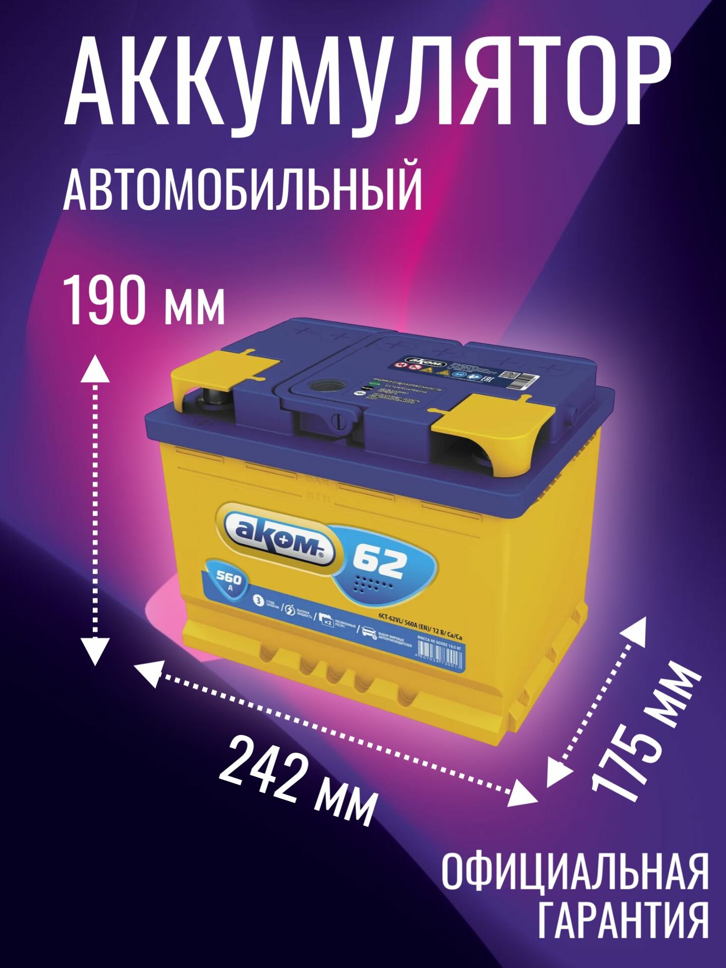 Аккумулятор автомобильный АКОМ 62 R+ 12В 62Ач 560А