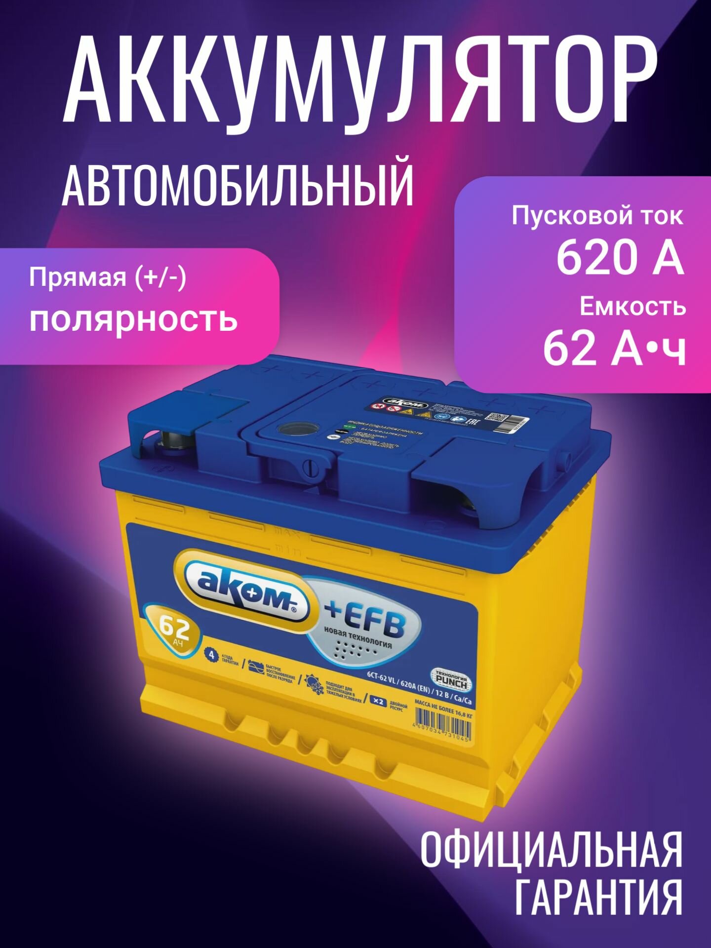 Ниже Вы можете прочитать отзывы на Аккумулятор автомобильный АКОМ + EFB 62 L+ 12В 62Ач 620А, ознакомится с подробными характеристиками, посмотреть интересные обзоры и фотографии на Аккумулятор автомобильный АКОМ + EFB 62 L+ 12В 62Ач 620А.