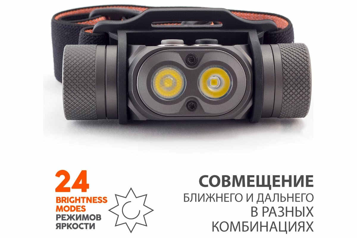 ближний рассеивается линзой а не рефлектором независимое управление яркостью диодов зарядка от usb индикация зарядки и разряда отличный внешний вид + наголовье |