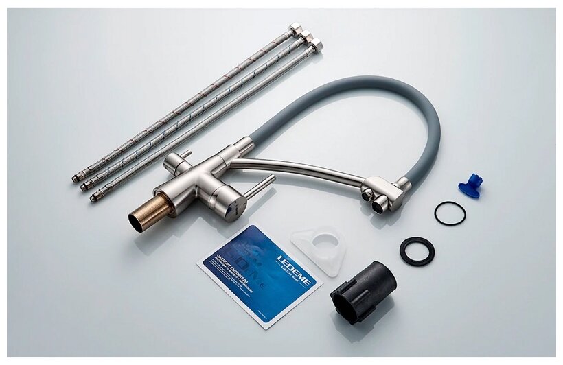 Смеситель для кухни с гибким изливом и встроенным краном под фильтр питьевой воды Ledeme L4855A-9 серый/суперсталь