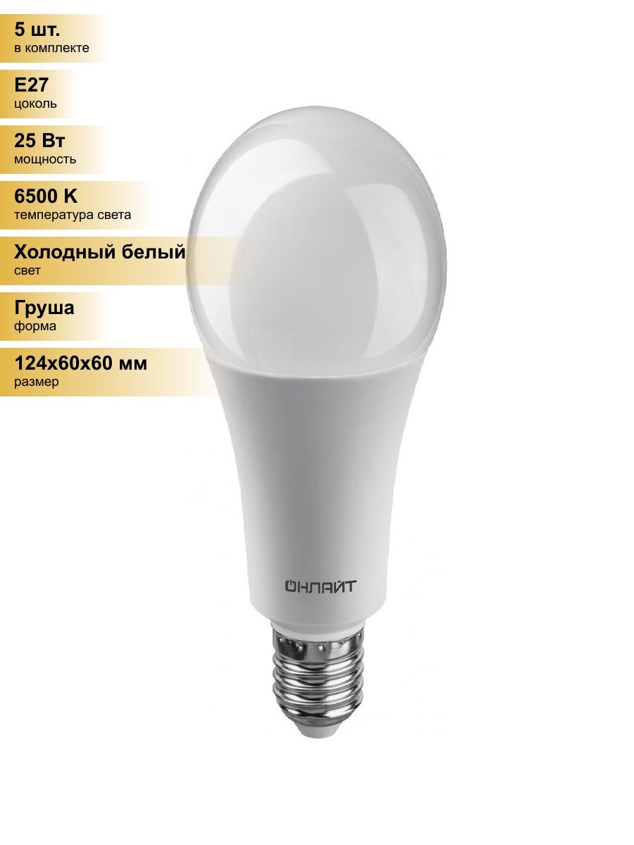Купить (5 шт.) Светодиодная лампочка онлайт ЛОН A60/A70 E27 25W(2100Lm) 6500K 6K 124x60 ОLL-A70-25-230-6K-E27 61955 Холодный белый. Цоколь E27