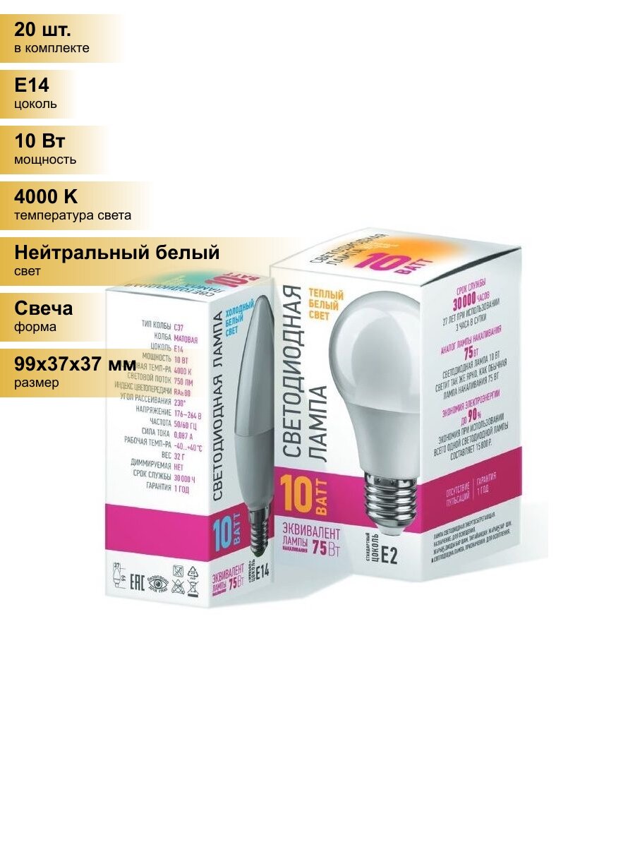 (20 шт.) Светодиодная лампочка онлайт промо свеча С37 E14 10W (750lm) 4000K 4K 99x37 OLL-C37-10-230-4K-E14-PROMO, 82915 . Цоколь E14