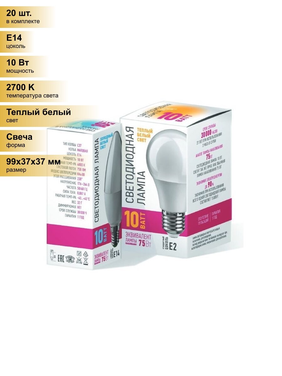 Купить (20 шт.) Светодиодная лампочка онлайт промо свеча С37 E14 10W (700lm) 2700K 2K 99x37 OLL-C37-10-230-2.7K-E14-PROMO, 82914 Теплый белый. Цоколь E14