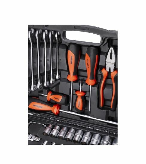 | Инструменты в комплекте | молоток / отвёртки / рукоять для бит / трещотка / пассатижи / ключи гаечные / клещи переставные / ключи имбусовые (шестигранные) |
