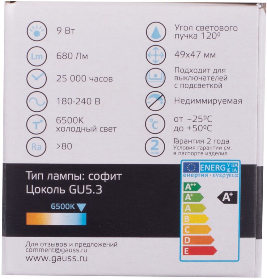 Купить Лампочка светодиодная MR16 9W 680lm 6500K GU5.3 УПАКОВКА 10 шт. Gauss Elementary