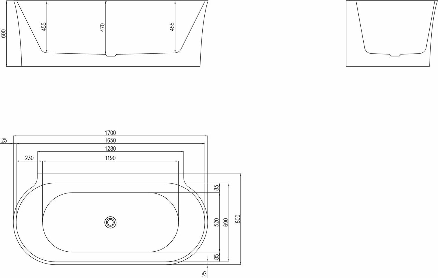 Пристенная, овальная акриловая ванна в комплекте со сливом-переливом BelBagno BB409-1700-800
