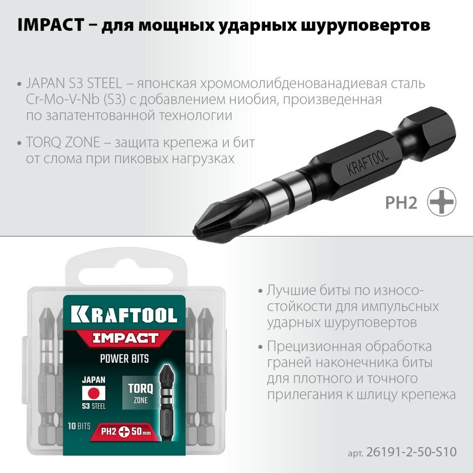 Ударные биты KRAFTOOL Impact Pro PH 2, 50 мм, 10 шт, (26191-2-50-S10)