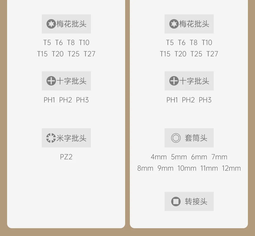 | Биты подробно | PH1, PH2, PH3, SL4, SL5, SL6, PZ2, T5, T6, T8, T10, T15, T20, T25, T27, H1.5, H2, H2.5, H3, H4, H5, H6, H6.35, H8 |