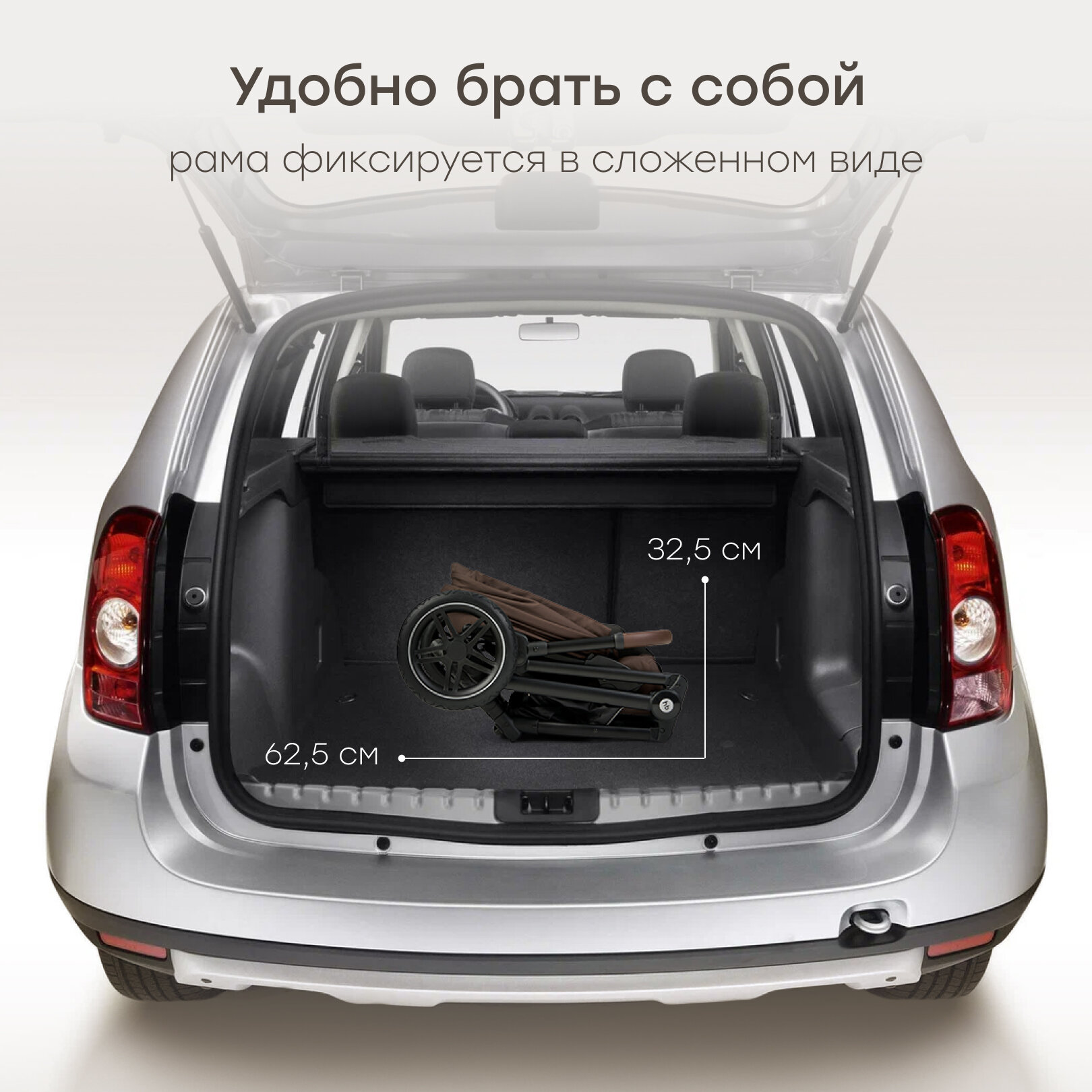 Занимает приемлемое место в багажнике - компактная; Вес небольшой; Ребёнку удобно и сидеть и лежать. |