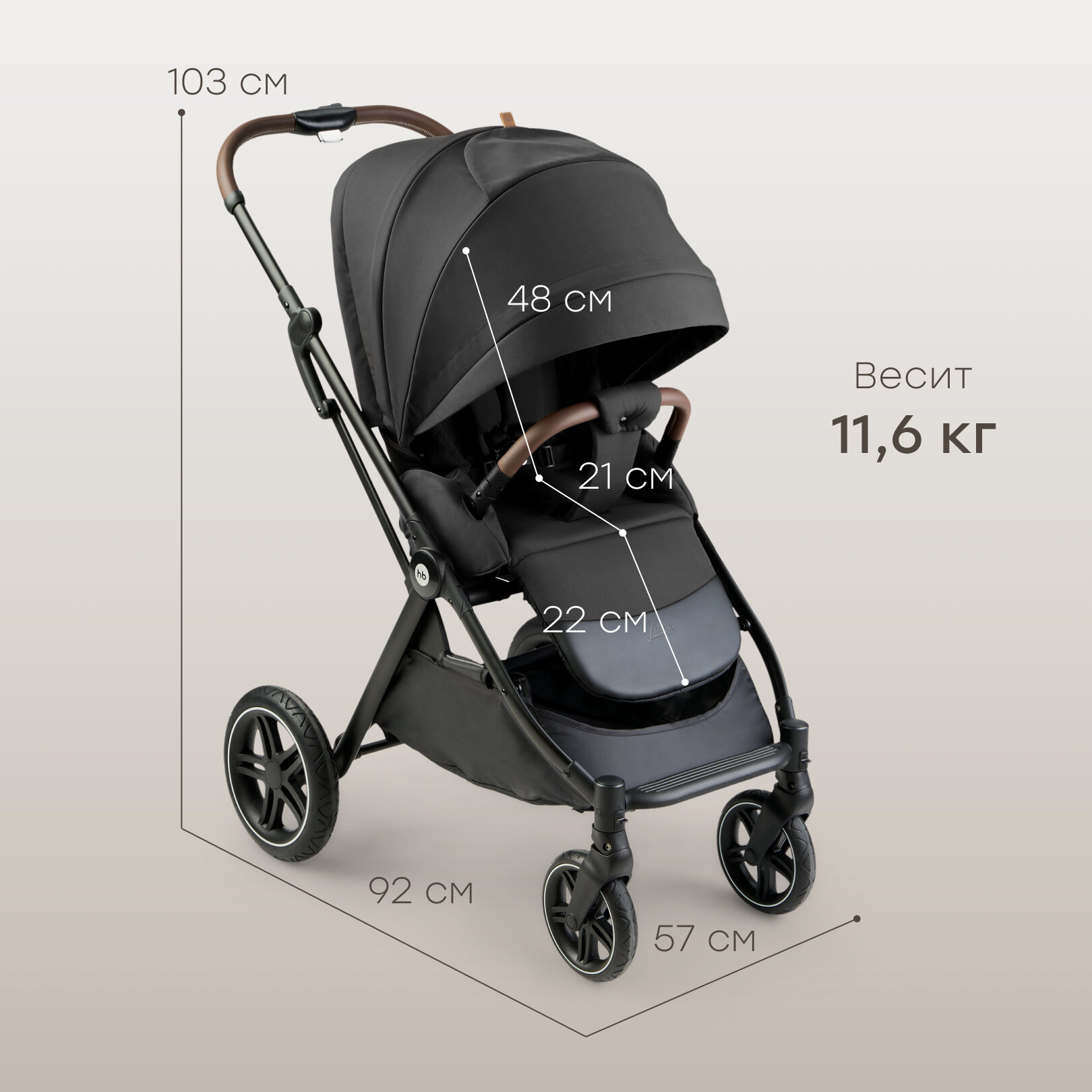 Коляска прогулочная детская Happy Baby LUNA, съемный бампер, капюшон, дождевик, москитная сетка, коричневая обивка, черная ручка