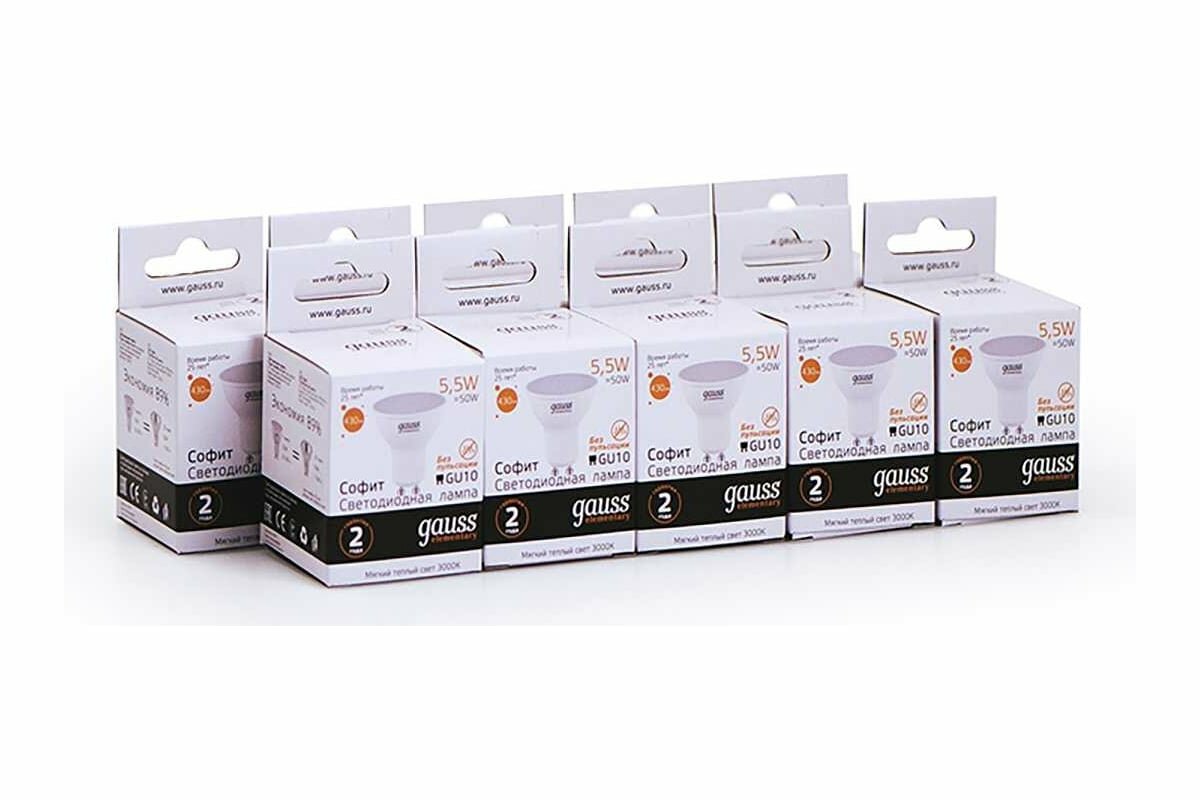 Набор из 10 штук Лампа Gauss Elementary MR16 5.5W 430lm 3000К GU10 LED 1/10/100
