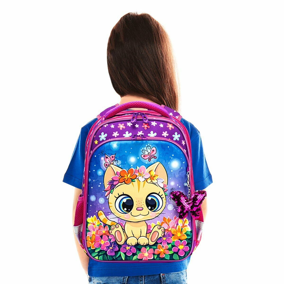 Ранец / рюкзак / портфель школьный для девочки первоклассницы Brauberg Quadro, 3 отделения, с брелком, Charming kitten, 37х28х18 см