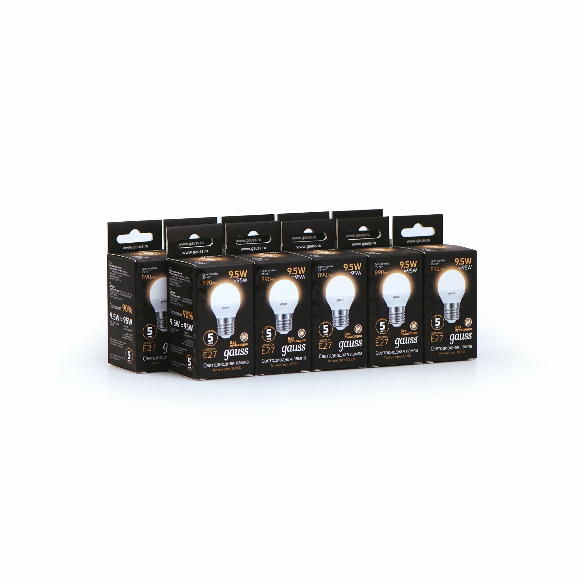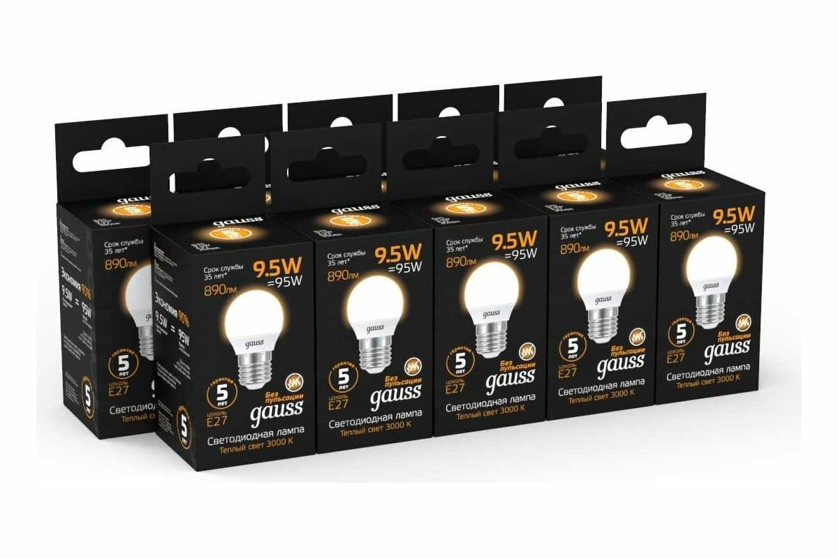 Комплект 5 штук, Лампа светодиодная Gauss LED Шар E27 9.5Вт 890Лм 3000K (105102110)