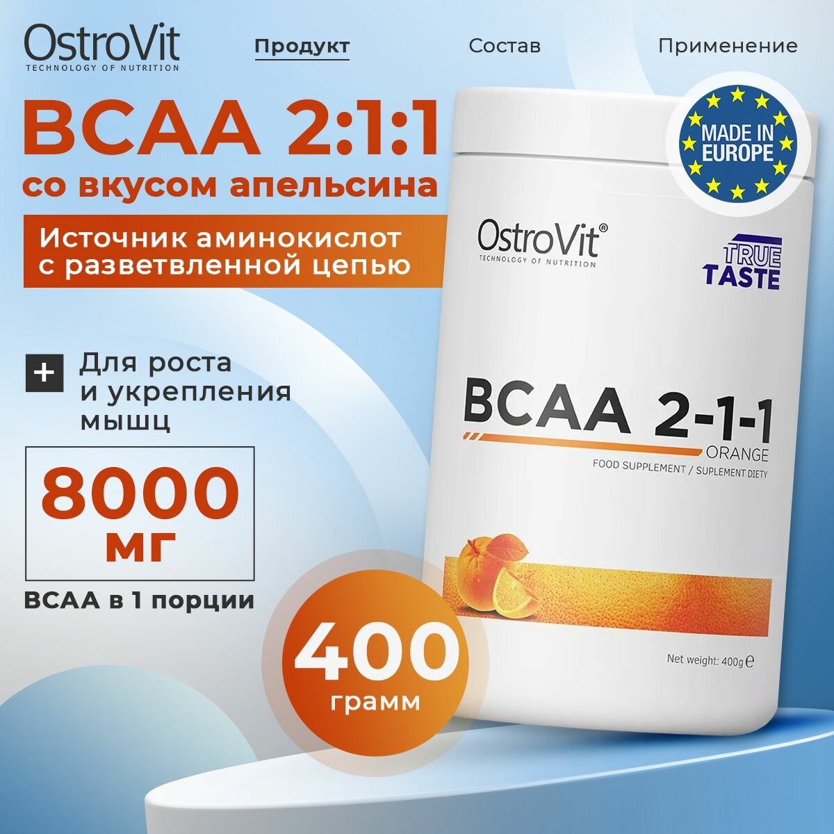Купить Ostrovit, BCAA 2:1:1, Спортивное питание, Аминокислоты для набора мышечной массы и похудения, порошок 400г со вкусом апельсина