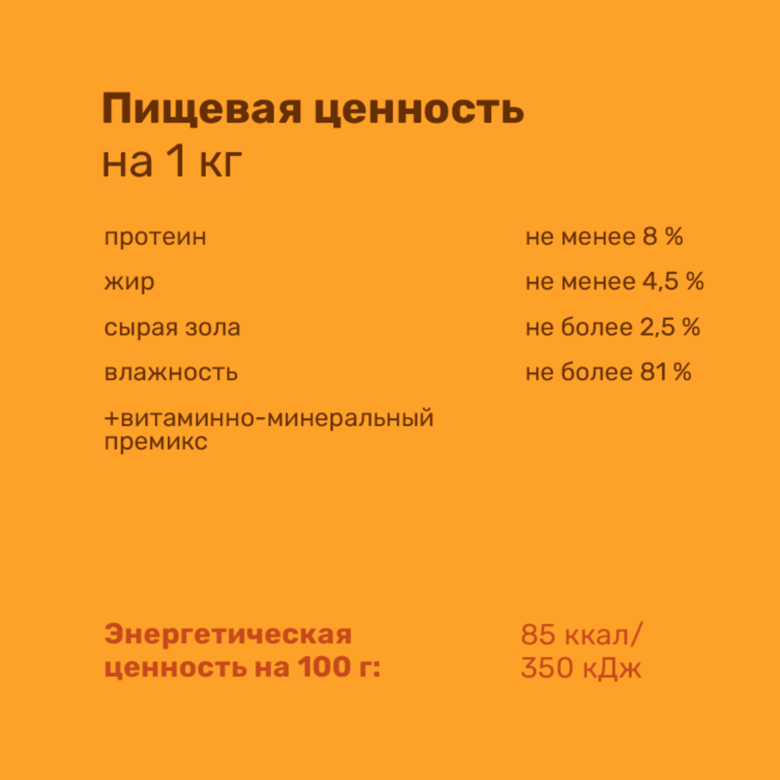 | Пищевая ценность | белок 6.5%, жир 4.5%, клетчатка 0.5%, зола 2%, влага 81% |