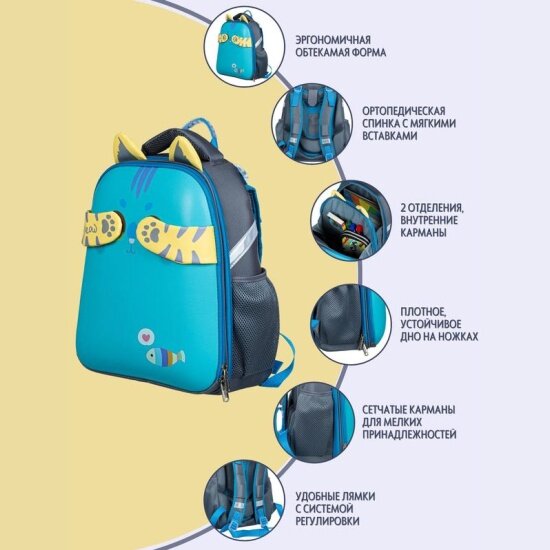 Рюкзак школьный Комус Котик с рыбкой, портфель анатомический для мальчика и девочки, 2 отделения, 4 кармана