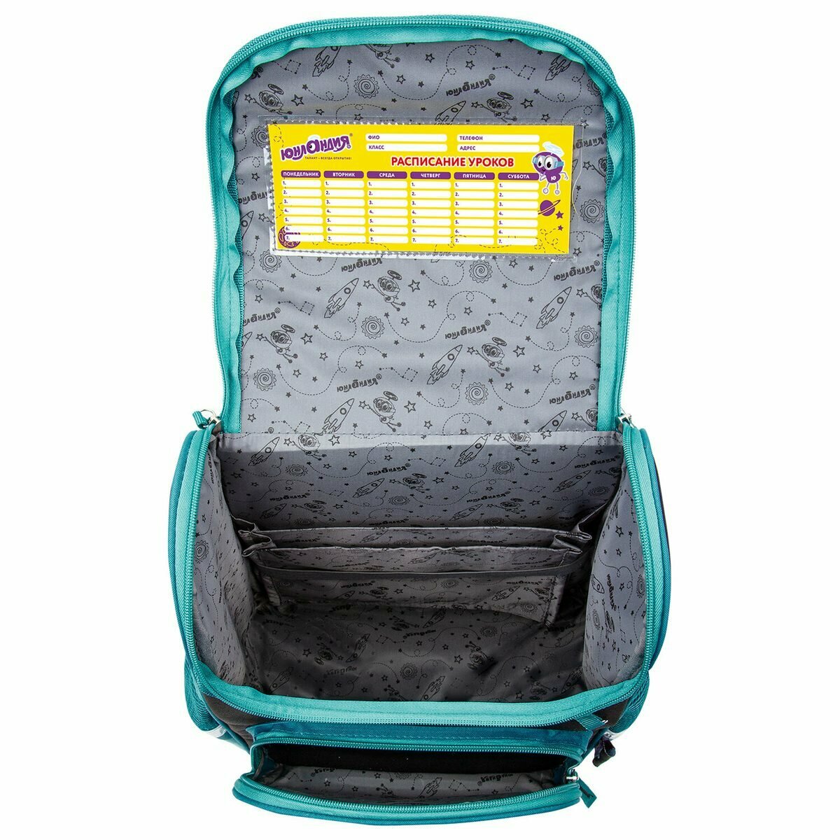 | Дополнительная информация | вкладыш для заполнения расписания уроков и контактной информации школьника на внутренней стенке крышки ранца; количество внешних карманов: 3 |