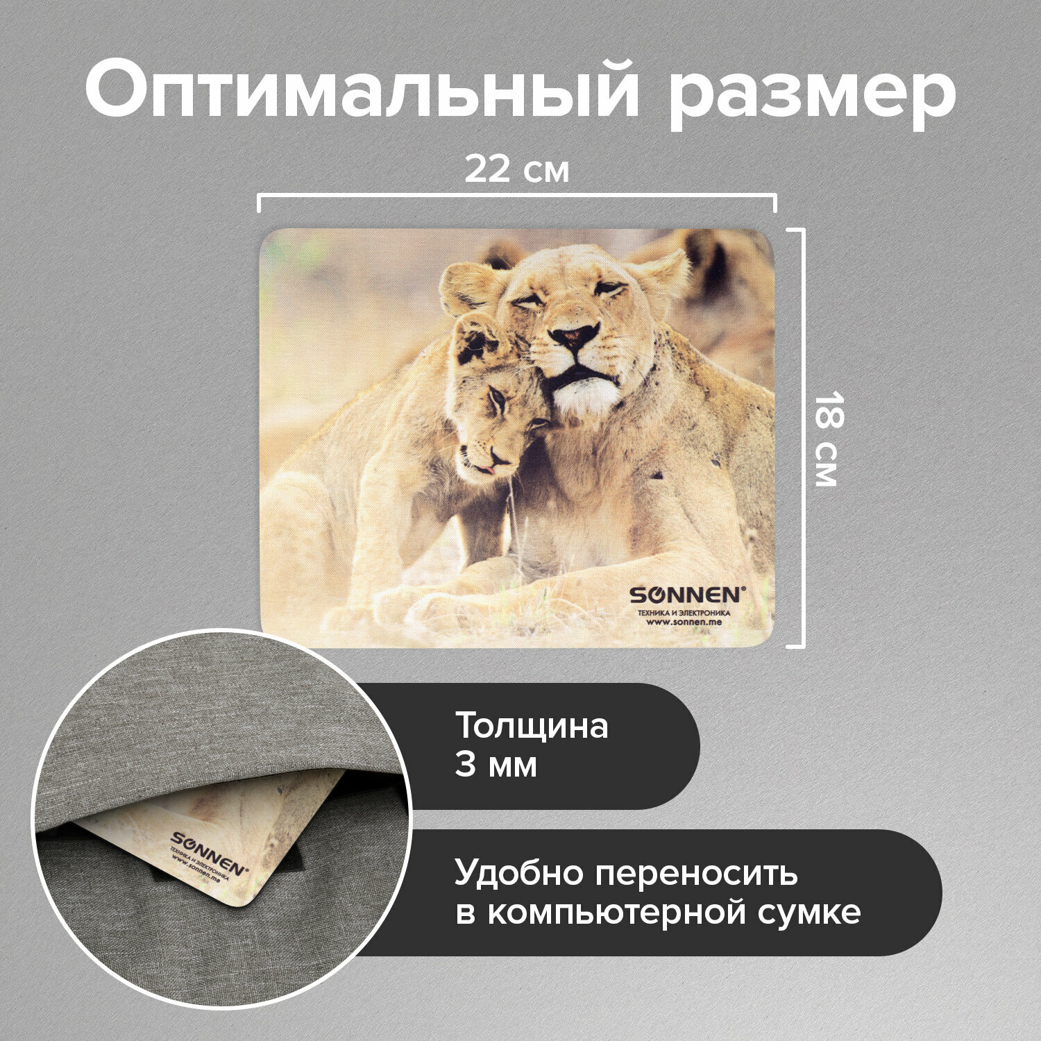 Купить Коврик для мыши Sonnen Lions, резина + ткань, 220х180х3 мм, 513310
