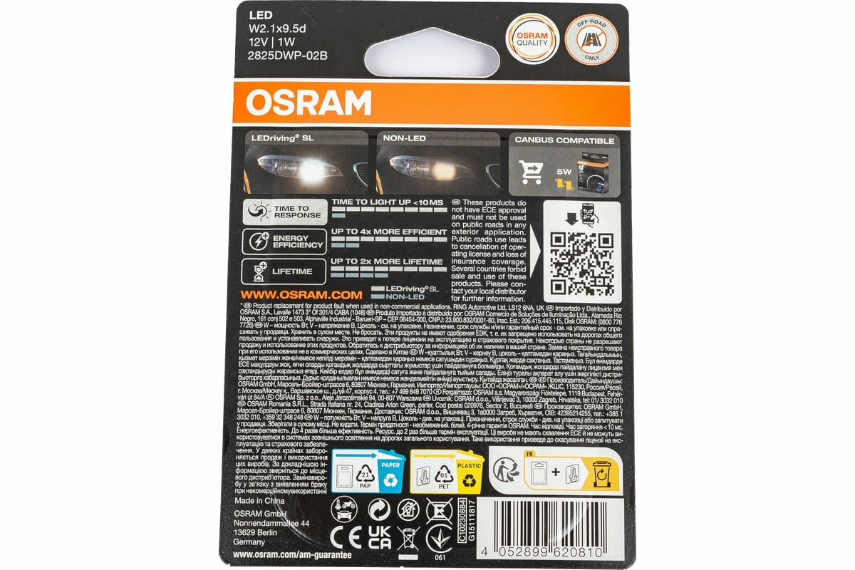 2825Dwp-02B_к-Кт Ламп! Ledriving Sl 2Шт 0.8W/12V W5w W2.1x9.5d Bli2 Белый 6000K Osram арт. 2825DWP-02B