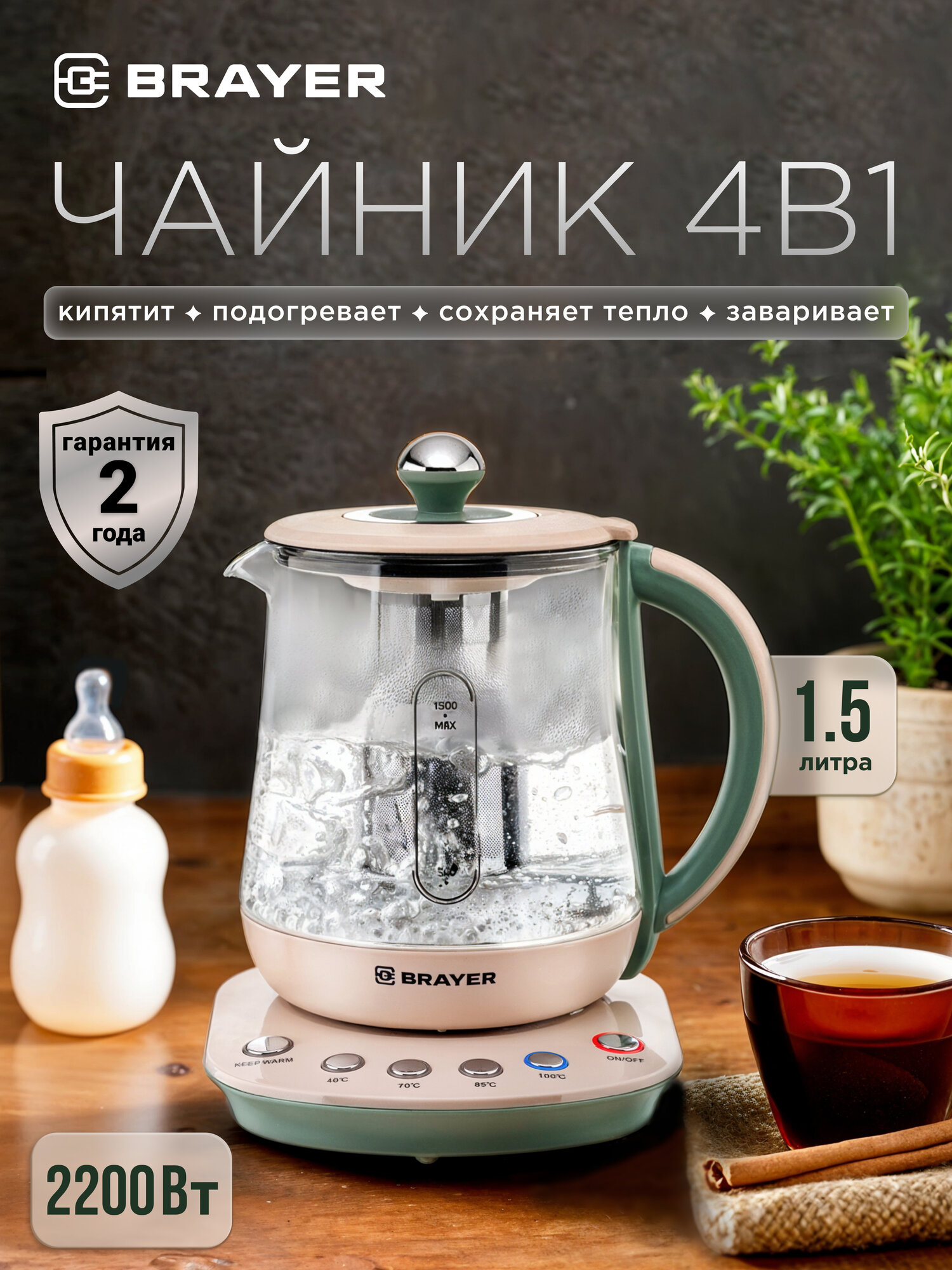 Электрический чайник BRAYER BR1015 2200 Вт, 1,5 л, подставка, подогрев 40-100 °С, заваривание чая, стекло