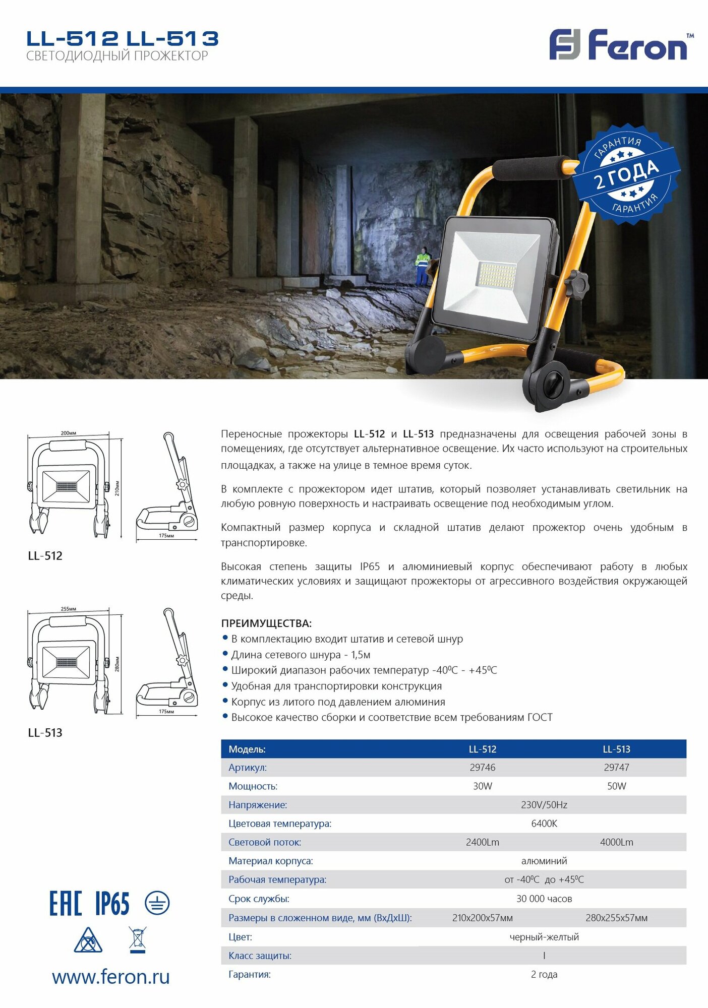 Feron Прожектор переносной, 50W, 6400K, 78*SMD2835, 4000Lm, Ip65, LL-513 29747 .