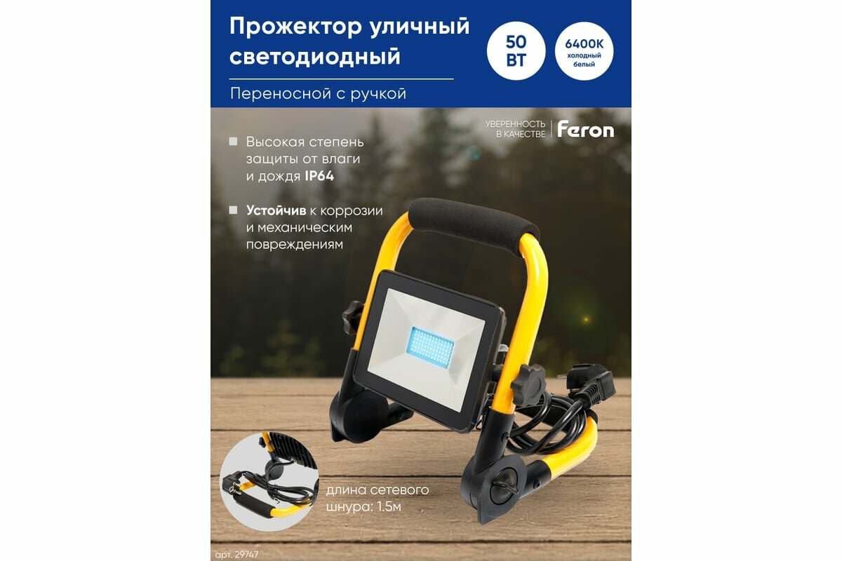 Прожектор светодиодный ДО-50w переносной 6400K 4000Лм IP65 | код 29747 | FERON (1 шт.)