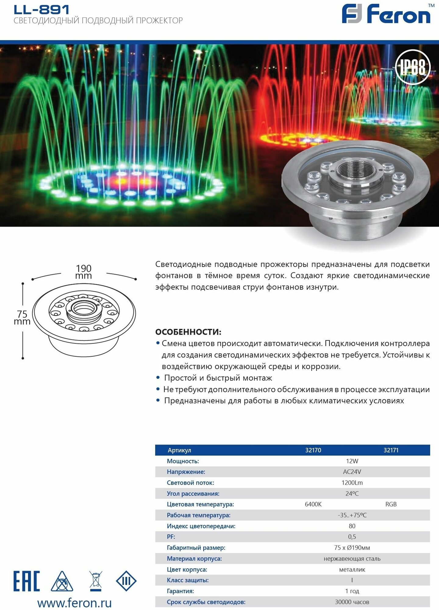 Светодиодный светильник подводный LL-891 12W RGB AC24V IP68, FERON 32171 (1 шт.)