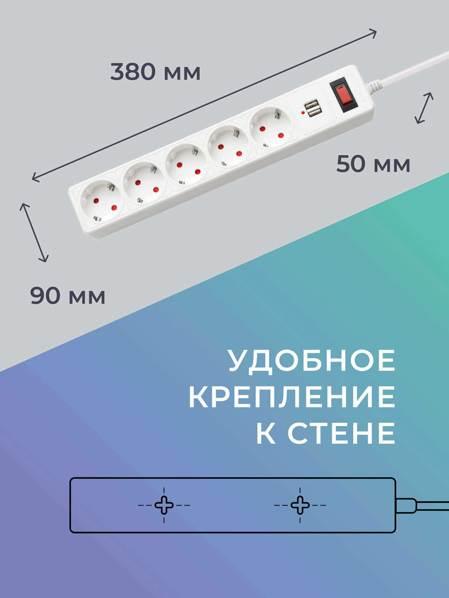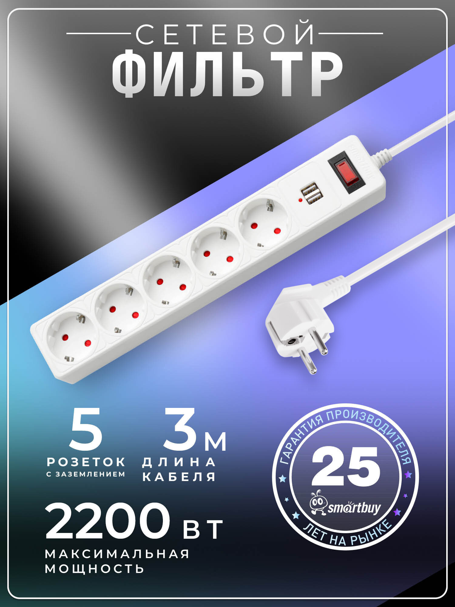 Сетевой фильтр Smartbuy c USB, 10А, 5 гнезд, c з/ш, земля, ПВС 3x0,75, 3 м, белый интересное: