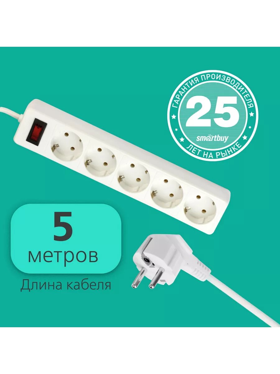Сетевой фильтр Smartbuy, 5 розеток, 5 м, 10 А, 2200 Вт, с з/к, белый Smartbuy 2799960 .