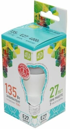 ASD Лампа светодиодная ASD LED-A60-standard, Е27, 15 Вт, 230 В, 4000 К, 1350 Лм