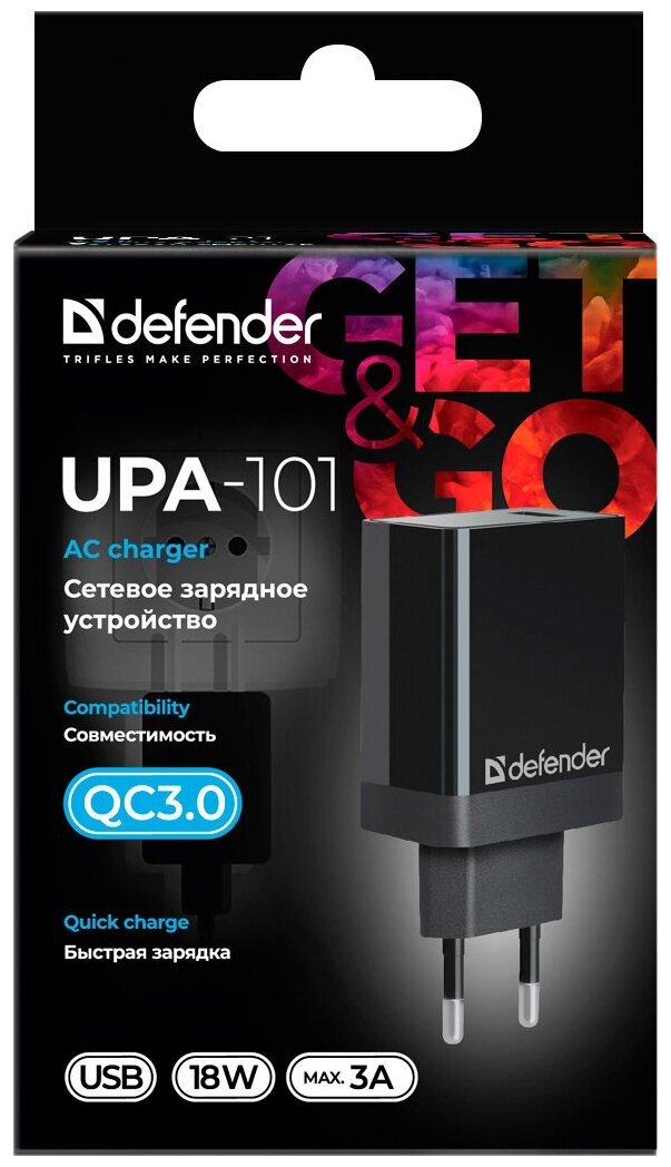 Зарядное устройство Defender сетевое, UPA-101, быстрая зарядка, QC 3,0, 18 W, черный (83573)