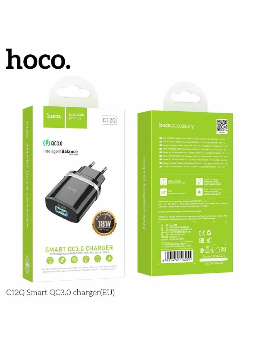 Зарядное устройство HOCO c12Q Smart QC3.0, один порт USB, 5V, 3.0A, черный